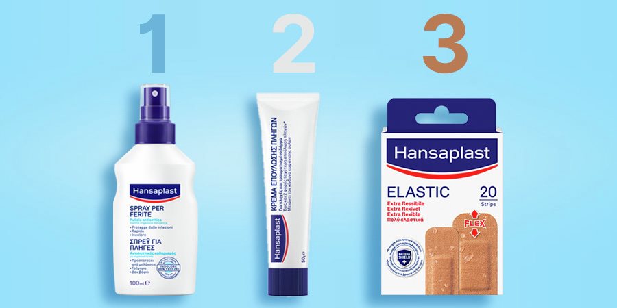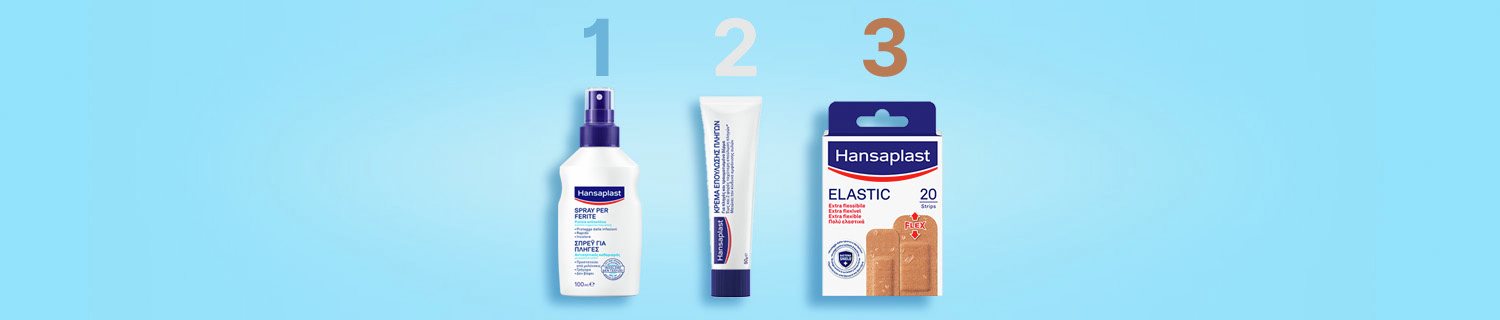 Προστασία: Το τρίτο βήμα είναι η προστασία της πληγής από εξωτερικούς παράγοντες όπως βρωμιά και βακτήρια, που επιτρέπει την επούλωσή της χωρίς εμπόδια. Καλύψτε την πληγή με ένα επίθεμα ή μία αποστειρωμένη γάζα πληγής Hansaplast.