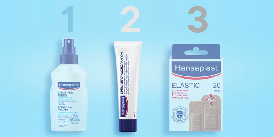 Το δεύτερο βήμα είναι να προστατεύσετε το τραύμα σας από τις βρωμιές και τα βακτήρια ώστε να πετύχετε επούλωση χωρίς εμπόδια. Καλύψτε το τραύμα σας με ένα επίθεμα ή μία αποστειρωμένη γάζα Hansaplast.